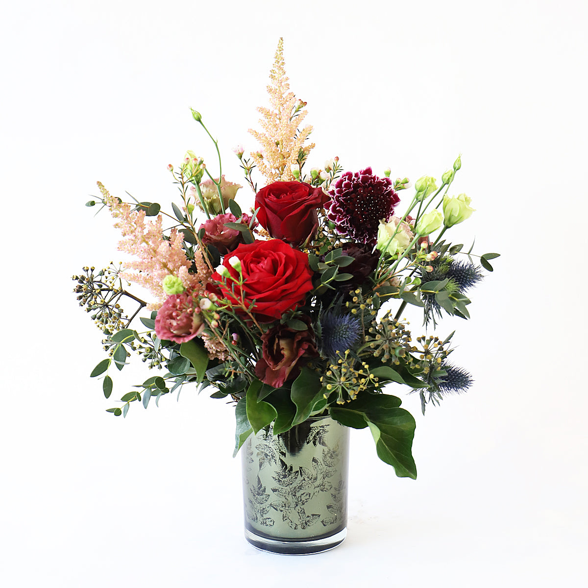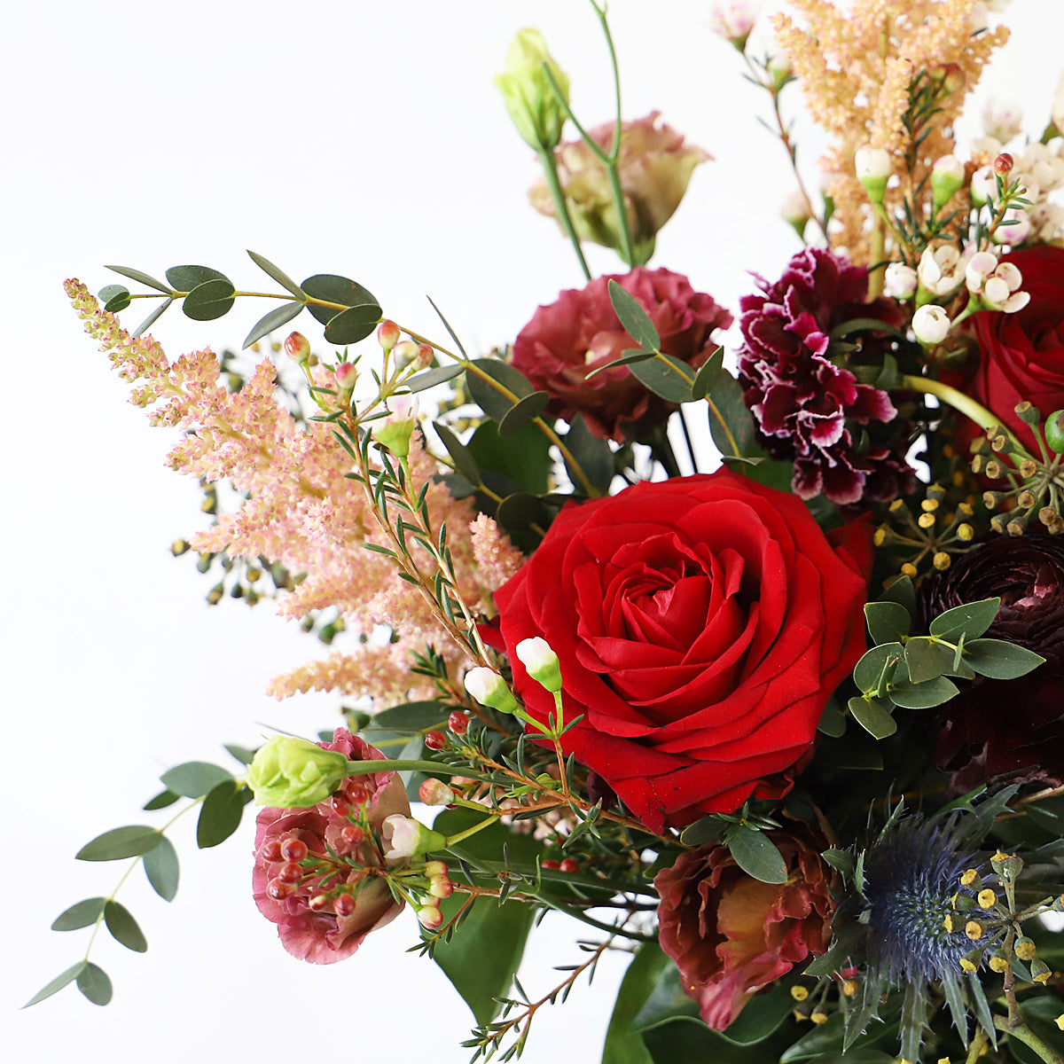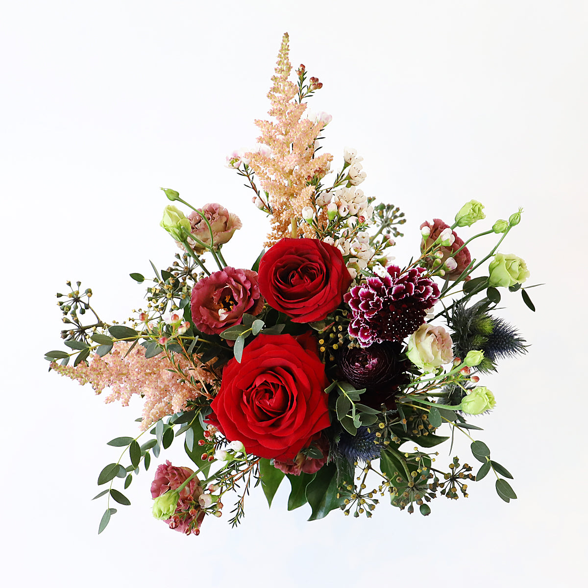 A small yet perfectly formed bouquet of flowers containing red roses, astilbe, lisianthus, thistle and other seasonal flowers.